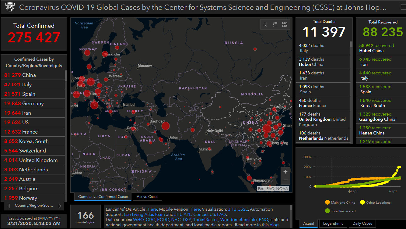 В мире 275 тысяч 427 случаев заражения коронавирусом. За сутки показатель вырос на 31 тысячу 6 человек. Вне КНР заразились 194,1 тысячи человек, а в самой республике — 81 тысяча 279. Больше всего зараженных в Италии (47 тысяч 21), Испании (21 тысяча 571), Германии (19 тысяч 848), Иране (19 тысяч 644), США (19 тысяч 624) и Франции (12 тысяч 632).