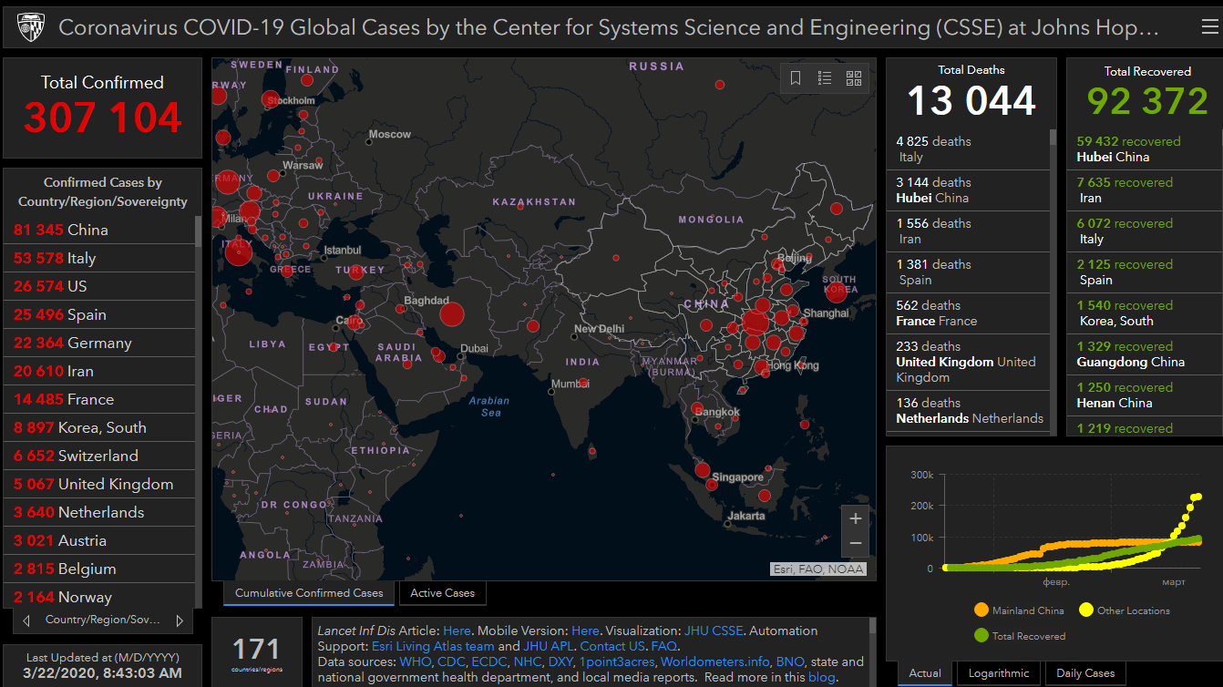 На сегодня случаи заболевания коронавирусом зафиксированы в 171 стране мира. Об этом свидетельствуют данные онлайн-карты, разработанной учеными.
