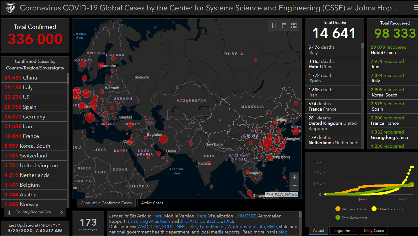 В мире на сегодня зарегистрировали 336 тысяч случаев заражения коронавирусом. Вне Китая заразились 254,6 тысячи человек, а в самой республике — 81 тысяча 435. Больше всего зараженных в Италии (59 тысяч 138), США (33 тысячи 276), Испании (28 тысяч 768), Германии (24 тысячи 873), Иране (21 тысяча 638) и Франции (16 тысяч 44).