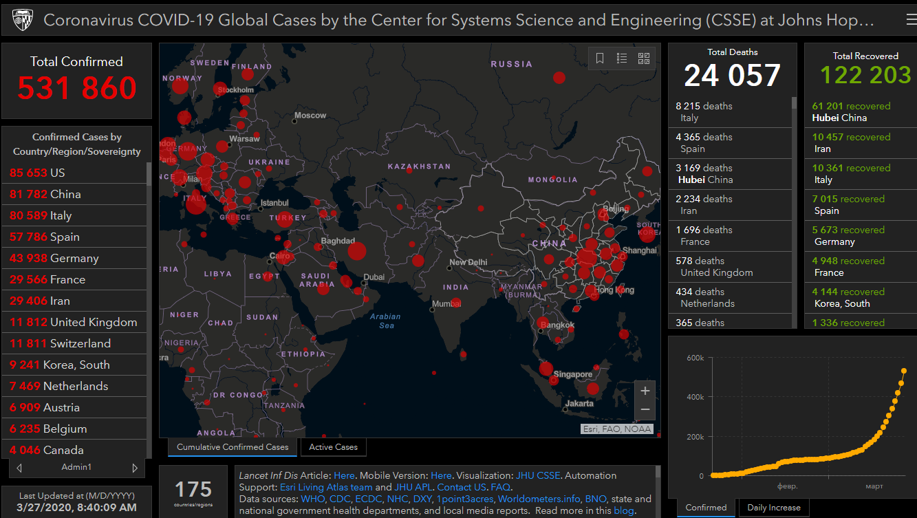 За последние сутки в мире число людей, которые заразились новым коронавирусом, достигло 531 тысячу 860. Об этом свидетельствуют данные онлайн-карты, разработанной учеными.