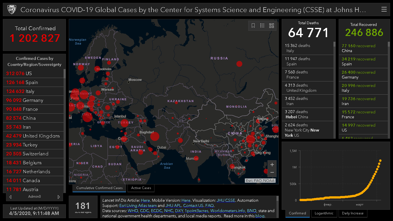 На сегодня число людей, зараженных новым коронавирусом, составляет 1 миллион 202 тысячи 827 человек. Об этом свидетельствуют данные онлайн-карты, разработанной учеными.