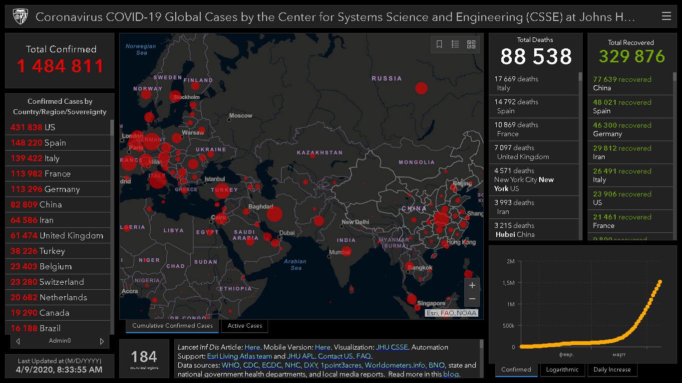 На сегодня в мире число людей, которые заразились вирусом, составило 1 миллион 484 тысячи 811. Больше всего зараженных в США (431 тысяча 838), Испании (148 тысяч 220), Италии (139 тысяч 422), Германии (113 тысяч 296), Франции (113 тысяч 982) и Иране (64 тысячи 586).