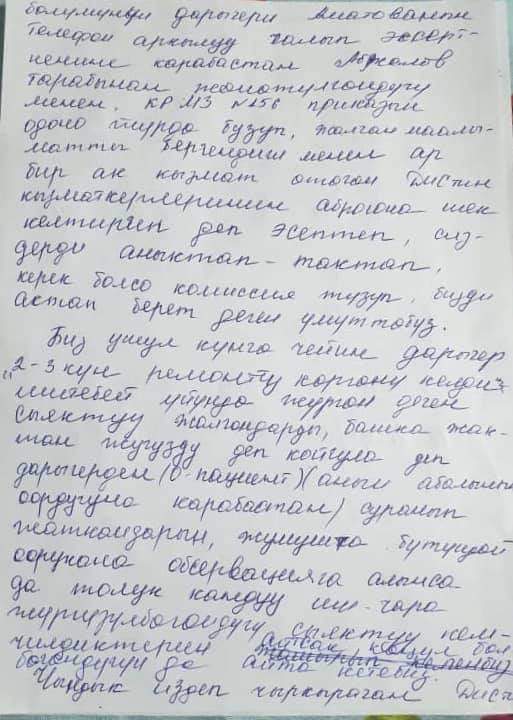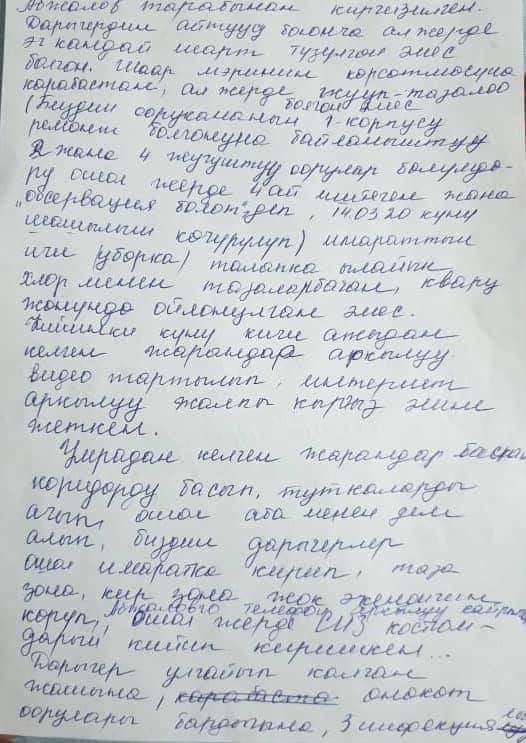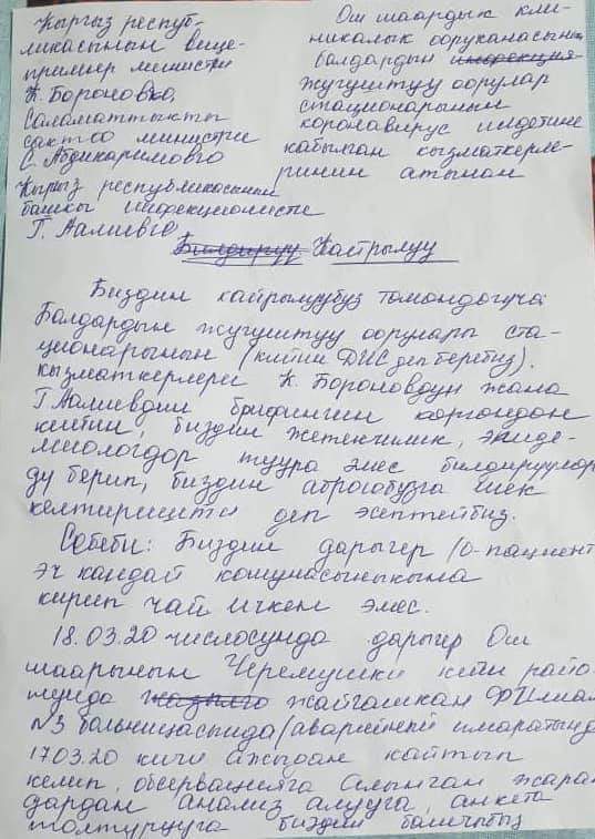 В одном письме указывается, что никто из них не был в гостях у паломников. По словам врача Тамилы Нуркамиловой, она несколько раз обращалась к заведующему отделением с просьбой взять у нее анализы, но ответа не последовало. В другом обращении — к вице-премьер-министру Кубатбеку Боронову, министру здравоохранения Сабиржану Абдикаримову — медики пишут, что у них не было средств индивидуальной защиты.