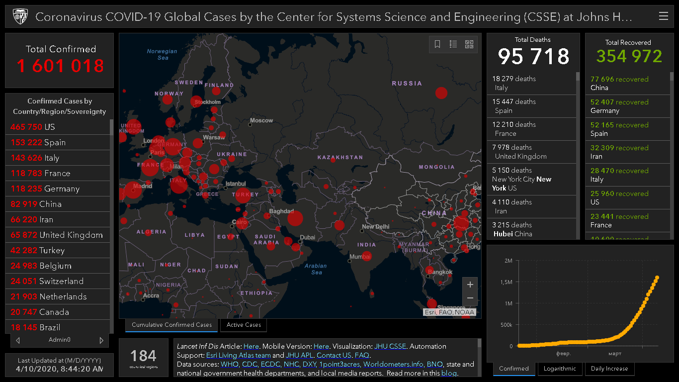 После заражения коронавирусом скончались 95 тысяч 718 человек (рост на 7 тысяч 180 за сутки). В том числе в Италии умерли 17 тысяч 669 человек, в Испании — 14 тысяч 792, во Франции — 10 тысяч 869.В Кыргызстане зарегистрировали 298 случаев заражения коронавирусом, в Казахстане — 781, в Узбекистане — 582. Все эти государства закрыли границы, чтобы не допустить распространения вируса. Из стран Центральной Азии вируса пока нет только в Таджикистане и Туркменистане.