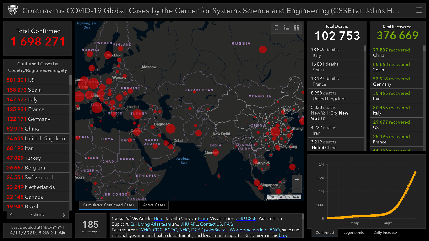 За последние сутки число людей, которые заразились новым коронавирусом, достигло 1 миллиона 698 тысяч 271. Об этом свидетельствуют данные онлайн-карты, разработанной учеными.