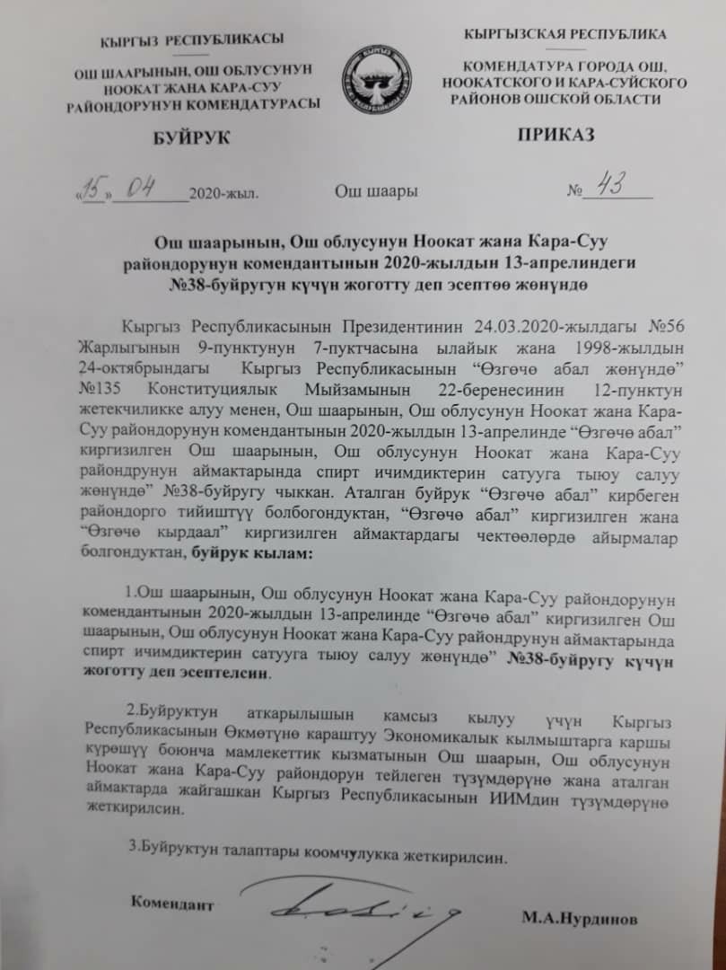 Новый приказ, отменяющий действие предыдущего, опубликовали в соцсетях. Документ датирован 15 апреля и подписан комендантом Оша и Ошской области Маликом Нурдиновым.