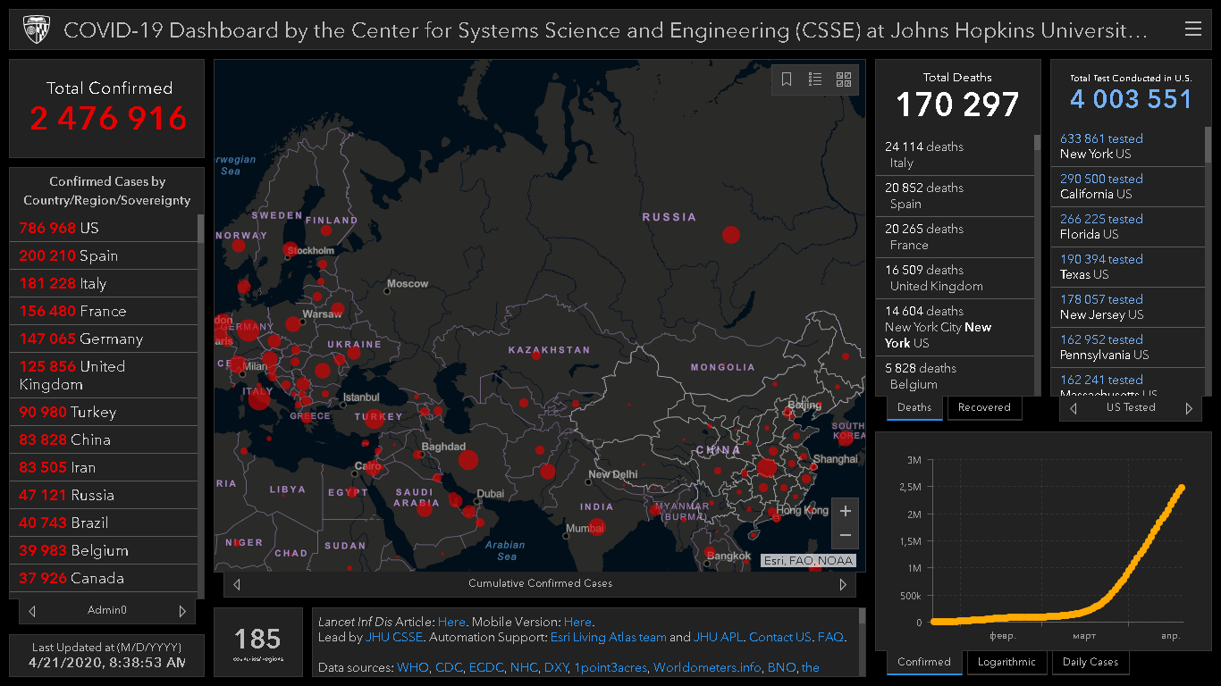 На сегодня в мире зафиксировали 2 миллиона 476 тысяч 916 случаев заражения коронавирусом. Больше всего зараженных в США (786 тысяч 968), Испании (200 тысяч 210), Италии (181 тысяча 228), Франции (156 тысяч 480), Германии (147 тысяч 65) и Великобритании (125 тысяч 856).