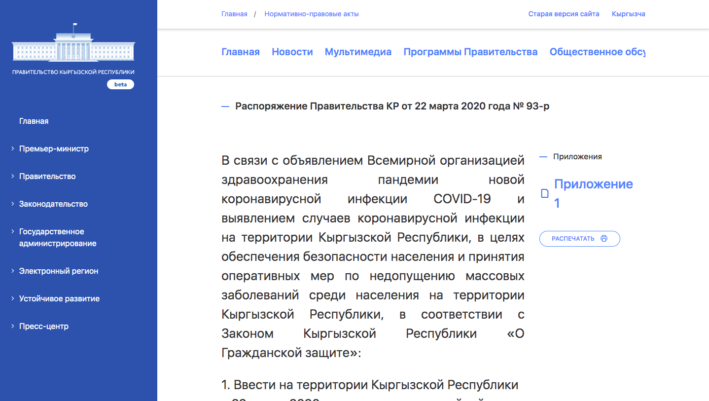 Отметим, что распоряжение правительства КР от 22 марта 2020 года № 93-р действительно опубликовано на сайте кабмина, но ошибку уже исправили.