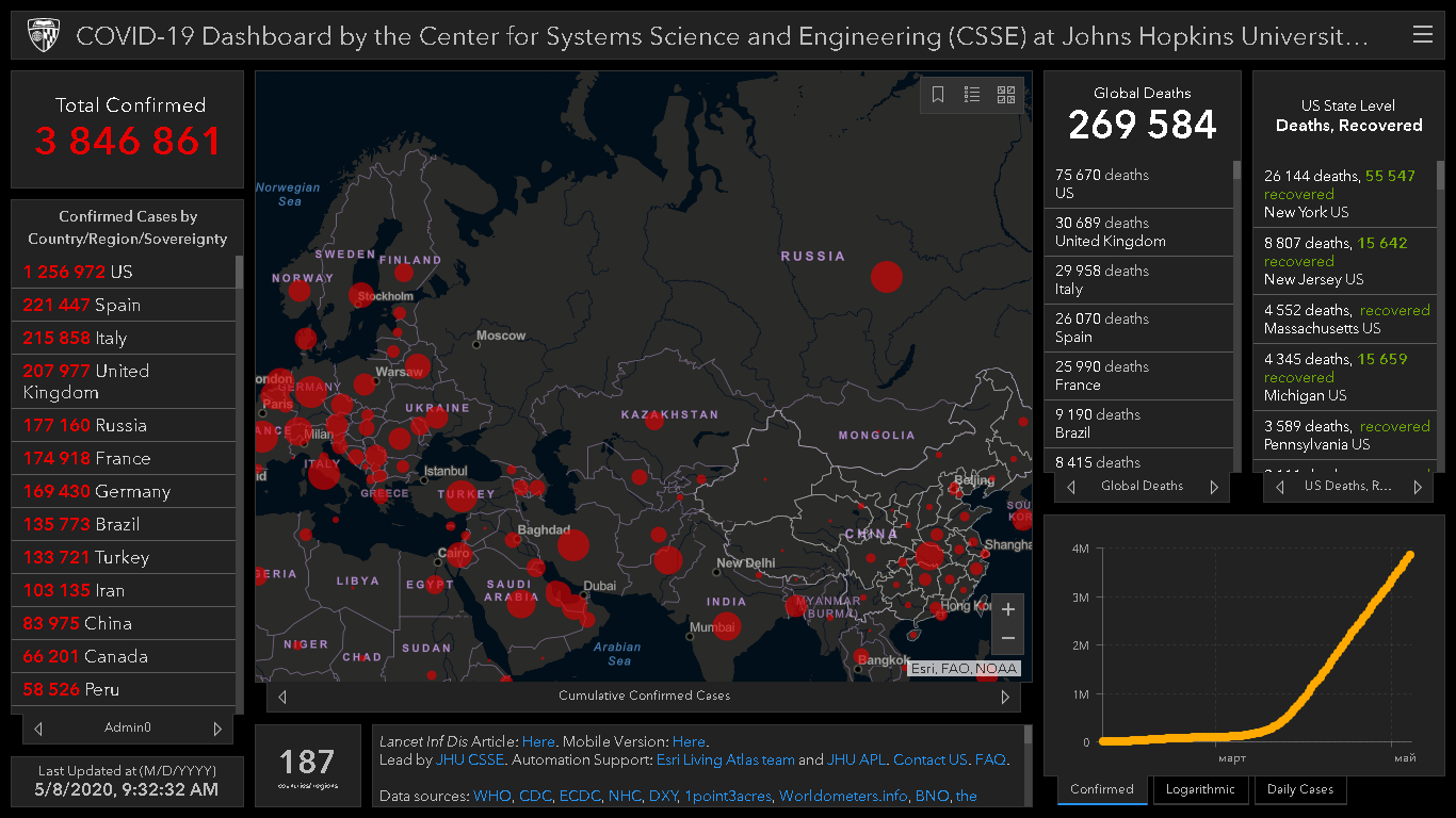 Всего в мире коронавирусом заразились 3 миллиона 846 тысяч 861 человек. Больше всего зараженных в США (1 миллион 256 тысяч 972), Испании (221 тысяча 447), Италии (215 тысяч 858), Великобритании (207 тысяч 977), России (177 тысяч 160), Франции (174 тысячи 918) и Германии (169 тысяч 430).