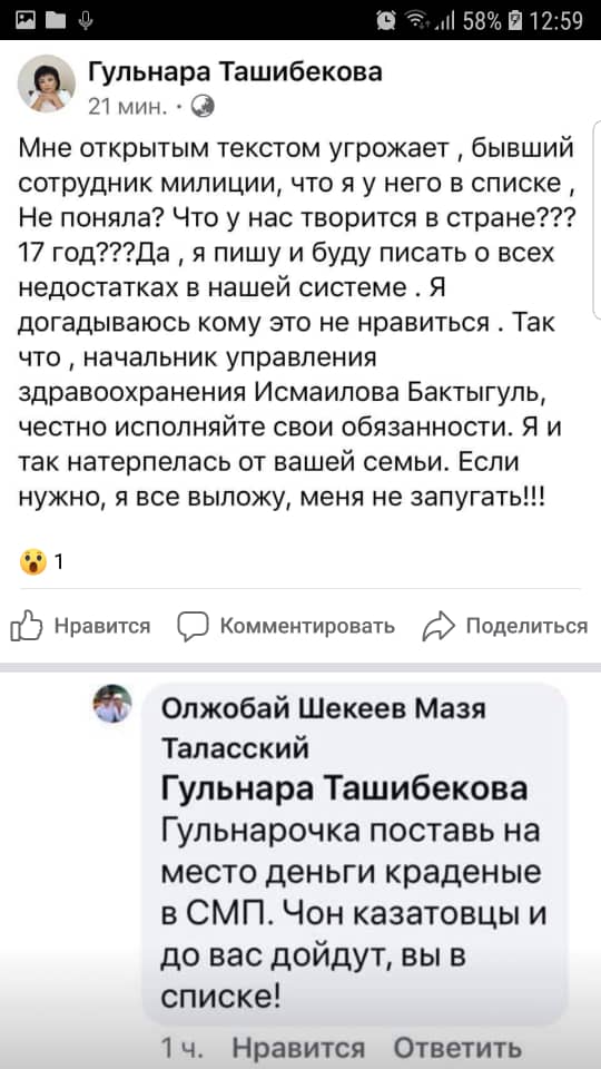 По ее словам, несмотря на угрозы, она будет продолжать писать о недостатках системы здравоохранения. Врач просит начальника управления здравоохранения мэрии Бишкека Бактыгуль Исмаилову прекратить нападки на нее.