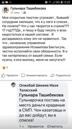 Главе ЦСМ № 17 Гульнаре Ташибековой угрожает бывший сотрудник милиции Олжобай Шакеев. Об этом врач написала на своей странице в Facebook.