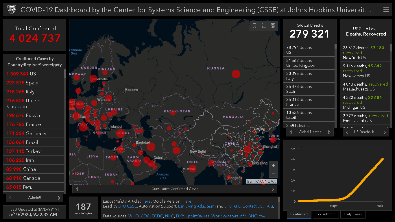 Всего в мире коронавирусом заразились 4 миллиона 24 тысячи 737 человек. Больше всего зараженных в США (1 миллион 309 тысяч 541), Испании (223 тысячи 578), Италии (218 тысяч 268), Великобритании (216 тысяч 525), России (198 тысяч 676), Франции (176 тысяч 782) и Германии (171 тысяча 324).