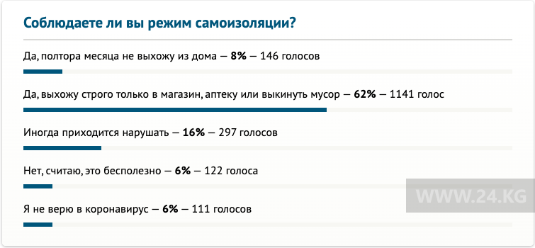 24-kg.com решило поинтересоваться у читателей, соблюдают ли они рекомендации Минздрава и Республиканского штаба по борьбе с коронавирусом. Выяснилось, что только 8 процентов (146 голосов) строго соблюдают режим самоизоляции и полтора месяца не покидали своего дома. 62 процента (1 тысяча 141 читатель) выходят на улицу только по острой необходимости — в магазин, аптеку или выкинуть мусор. 16 процентов читателей (297 человек) признались, что иногда вынужденно нарушают режим самоизоляции.