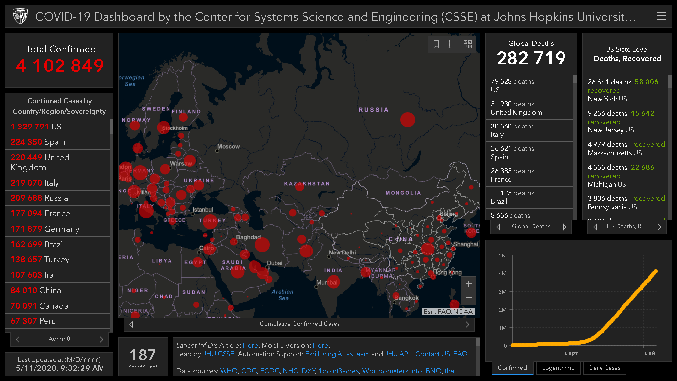 Всего в мире коронавирусом заразились 4 миллиона 24 тысячи 737 человек. Больше всего зараженных в США (1 миллион 329 тысяч 791), Испании (224 тысячи 350), Великобритании (220 тысяч 449), Италии (219 тысяч 70), России (209 тысяч 688), Франции (177 тысяч 94) и Германии (171 тысяча 879).