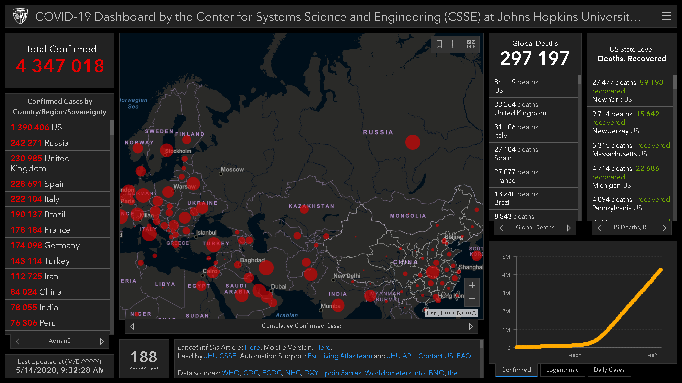 Всего в мире коронавирусом заразились 4 миллиона 347 тысяч 18 человек. Больше всего зараженных в США (1 миллион 390 тысяч 406), России (242 тысячи 271), Великобритании (230 тысяч 985), Испании (228 тысяч 691), Италии (222 тысячи 104), Бразилии (190 тысяч 137) и Франции (178 тысяч 184).