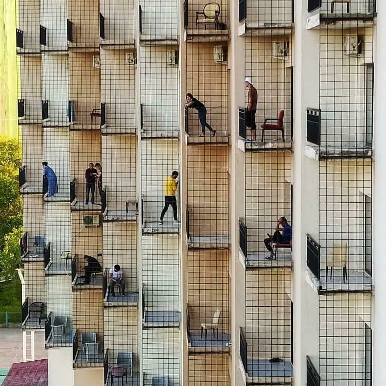 В кадр попала часть здания с балконами, где свежим воздухом дышат содержащиеся в обсервации.