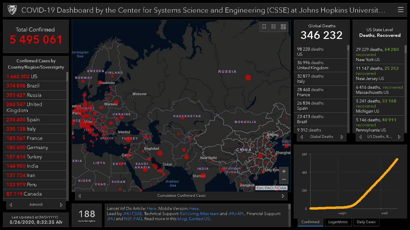 Всего в мире коронавирусом заразились 5 миллионов 495 тысяч 61 человек. Больше всего зараженных в США (1 миллион 662 тысячи 302), Бразилии (374 тысячи 898), России (353 тысячи 427), Великобритании (262 тысячи 547), Испании (235 тысяч 400), Италии (230 тысяч 158) и Франции (183 тысячи 67).
