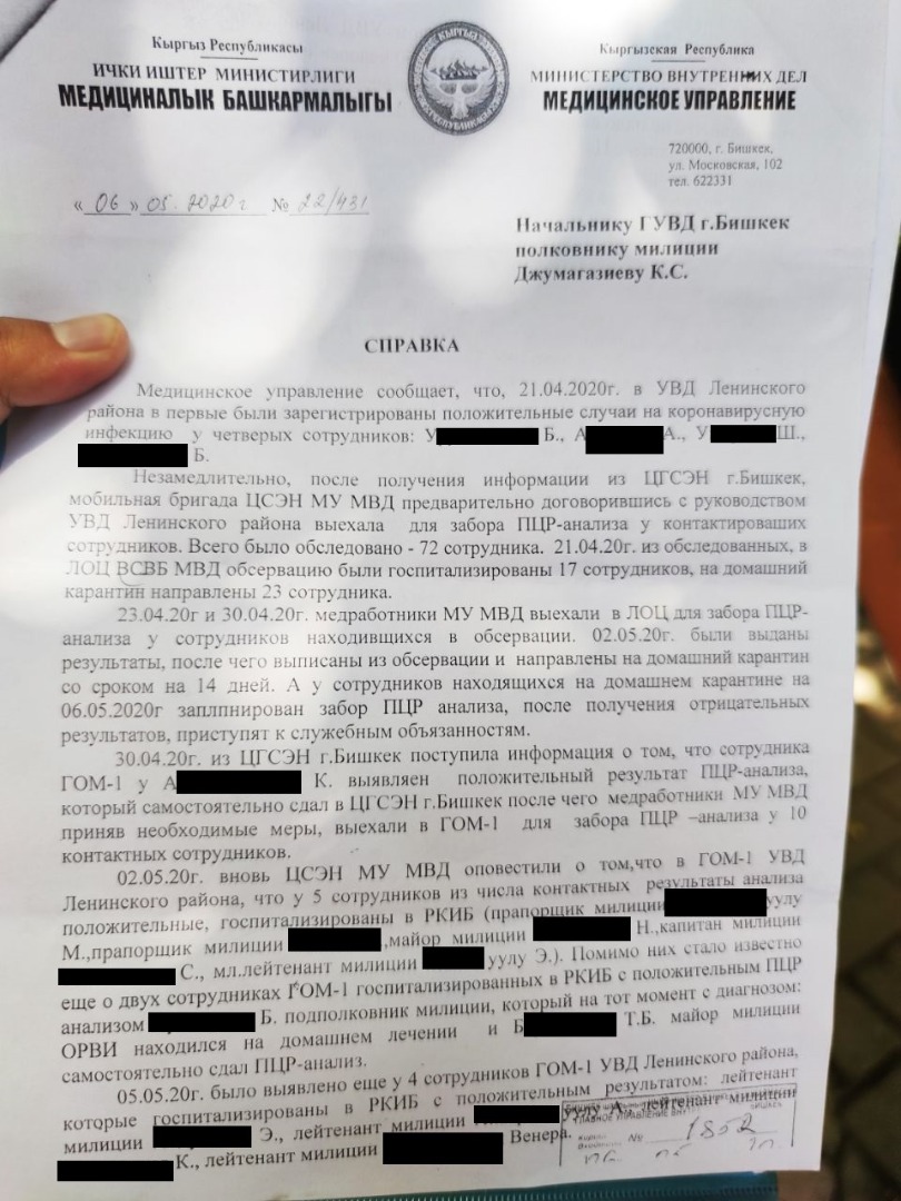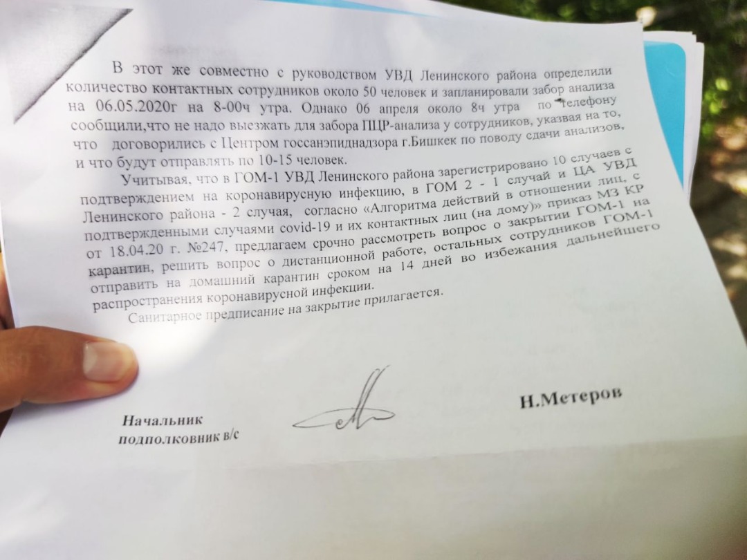 В распоряжении 24-kg.com есть письмо начальника медицинского управления МВД. 6 мая он направил его на имя главы ГУВД Каната Джумагазиева, указав необходимость закрытия отдела милиции на карантин и с просьбой решить вопрос о дистанционной работе. Однако ГОМ до сих пор не закрыли.