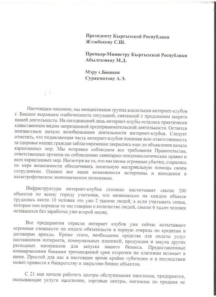 «Предоставленный коммерческими банками трехмесячный срок отсрочки по платежам истекает в июне. Простой для нас сейчас крайне губителен и впоследствии может привести к банкротству и закрытию бизнес-объектов. С 21 мая начали работать центры обслуживания населения, предприятия, оказывающие услуги населению, торговые центры, магазины по продаже непродуктовых товаров, авторынки и рынки скота, гостиницы. С 25 мая — вещевые рынки, кафе и рестораны, театры и музеи, а также общественный транспорт — автобусы, троллейбусы и маршрутные такси. В указанных сферах, так же, как и в нашей, предполагается поток людей, а в некоторых случаях намного превышающий посещение интернет-клубов. В связи с чем считаем, что интернет-клубы тоже имеют право получить разрешение на деятельность», — подчеркивается в обращении.