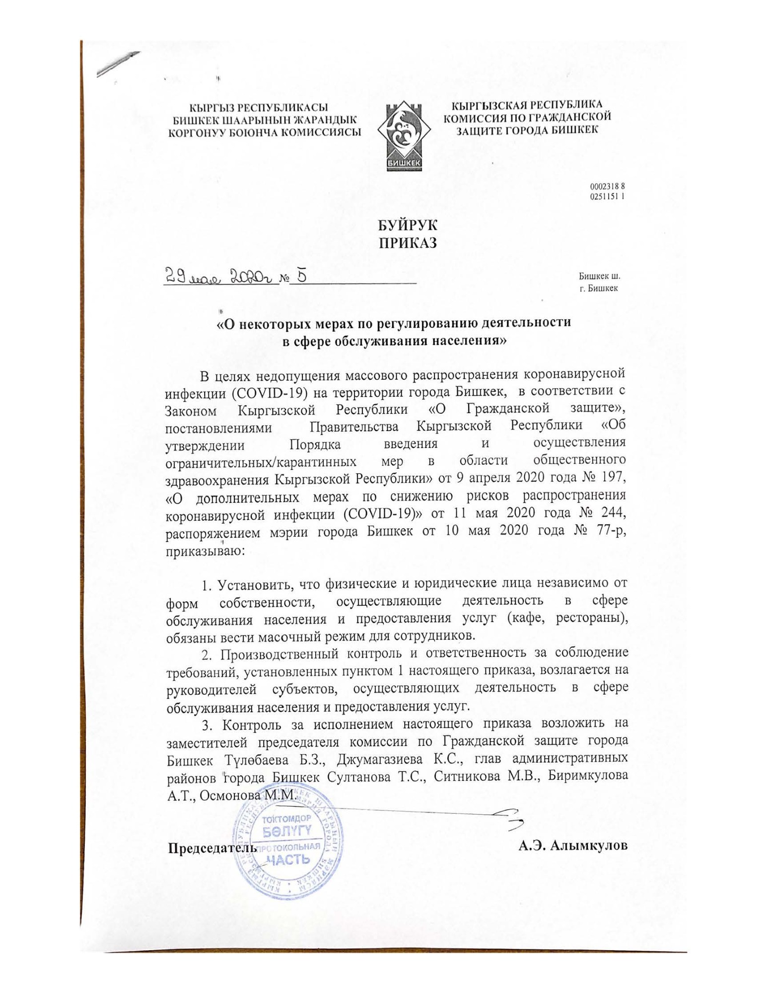 По ее данным, приказ подписал вице-мэр столицы, председатель комиссии по гражданской защите Азиз Алымкулов.