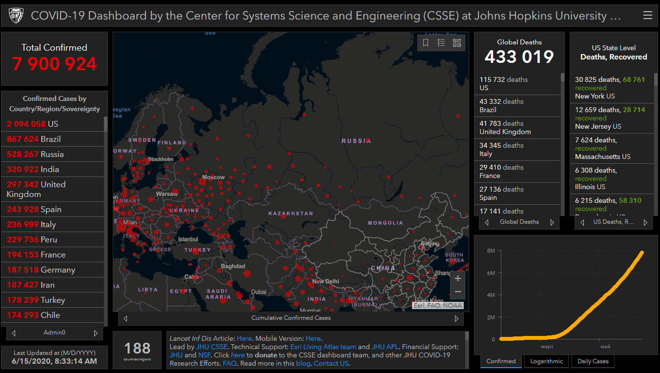 Всего в мире коронавирусом заразились 7 миллионов 900 тысяч 924 человека. Больше всего зараженных в США (2 миллиона 94 тысячи 58), Бразилии (867 тысяч 624), России (528 тысяч 267), Индии (320 тысяч 922), Великобритании (297 тысяч 342), Испании (243 тысячи 928) и Италии (236 тысяч 989).