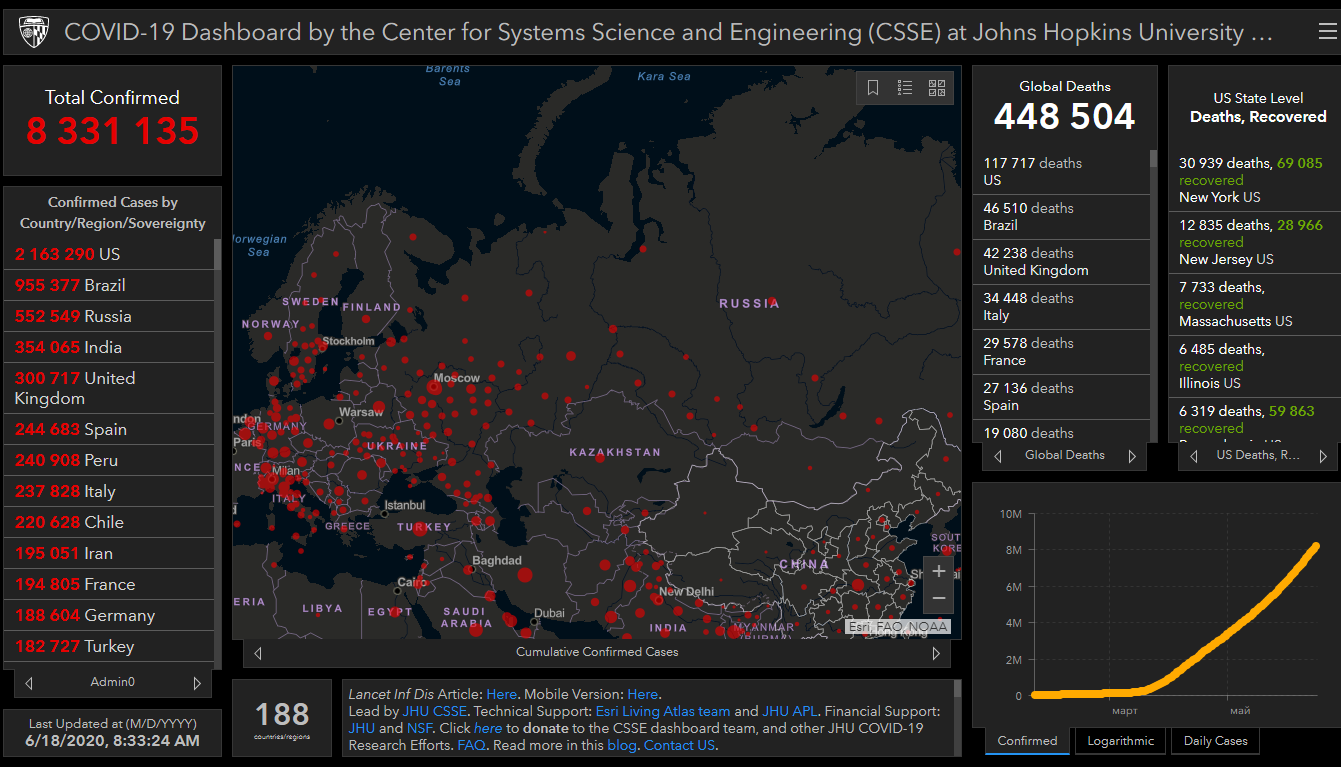 Всего в мире коронавирусом заразились 8 миллионов 331 тысяча 135 человек. Больше всего зараженных в США (2 миллиона 163 тысячи 290), Бразилии (955 тысяч 377), России (552 тысячи 549), Индии (354 тысячи 65), Великобритании (300 тысяч 717), Испании (244 тысячи 683) и Перу (240 тысяч 908).