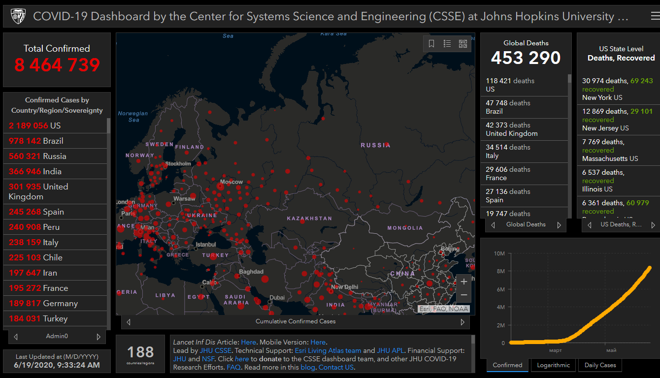 Всего в мире коронавирусом заразились 8 миллионов 464 тысячи 739 человек. Больше всего зараженных в США (2 миллиона 189 тысяч 56), Бразилии (978 тысяч 142), России (560 тысяч 321), Индии (366 тысяч 946), Великобритании (301 тысяча 935), Испании (245 тысяч 268) и Перу (240 тысяч 908).