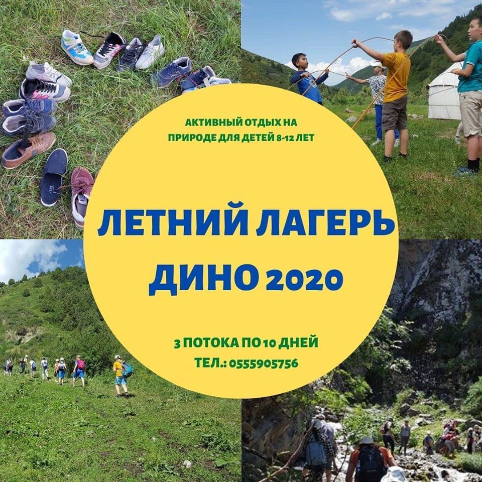 График работы: с 3 июля. Условия: для детей в возрасте 6-16 лет. В программе лагеря программирование, практика английского языка, клуб юного фотографа, конные прогулки, бассейн, поход в горы с ночевкой, треккинг на озеро Жашыл-Кол и другое.