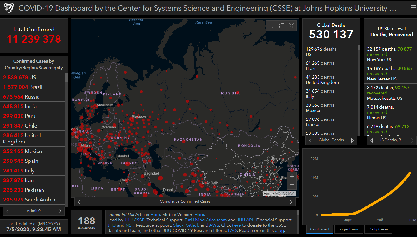 Всего в мире коронавирусом заразились 11 миллионов 239 тысяч 378 человек. Больше всего зараженных в США (2 миллиона 838 тысяч 678), Бразилии (1 миллион 577 тысяч 4), России (673 тысячи 564), Индии (648 тысяч 315), Перу (299 тысяч 80), Чили (291 тысяча 847) и Великобритании (286 тысяч 412).