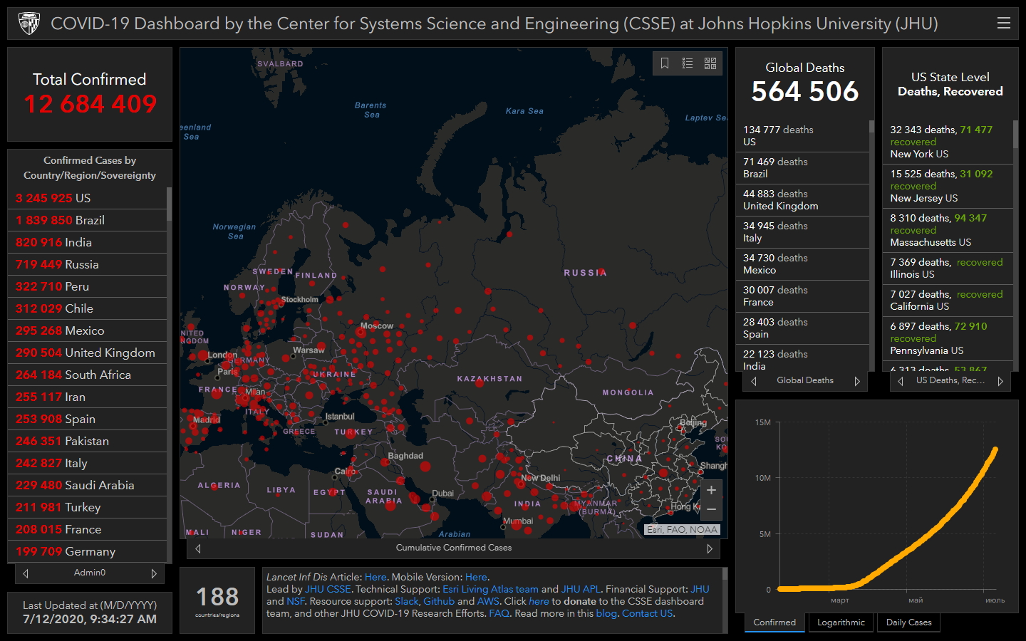 Всего в мире коронавирусом заразились 12 миллионов 684 тысячи 409 человек. Больше всего зараженных в США (3 миллиона 245 тысяч 925), Бразилии (1 миллион 839 тысяч 850), Индии (820 тысяч 916), России (719 тысяч 449), Перу (322 тысячи 710), Чили (312 тысяч 29), Мексике (295 тысяч 268) и Великобритании (290 тысяч 504).