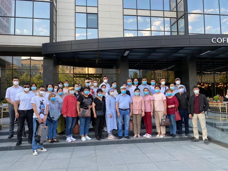 Первая группа из 26 кыргызстанских врачей-добровольцев прилетела 5 июля. В настоящее время они работают в инфекционных клиниках страны, в красных зонах. Их перелет также был организован за счет средств меценатов и при содействии посольства Кыргызстана.