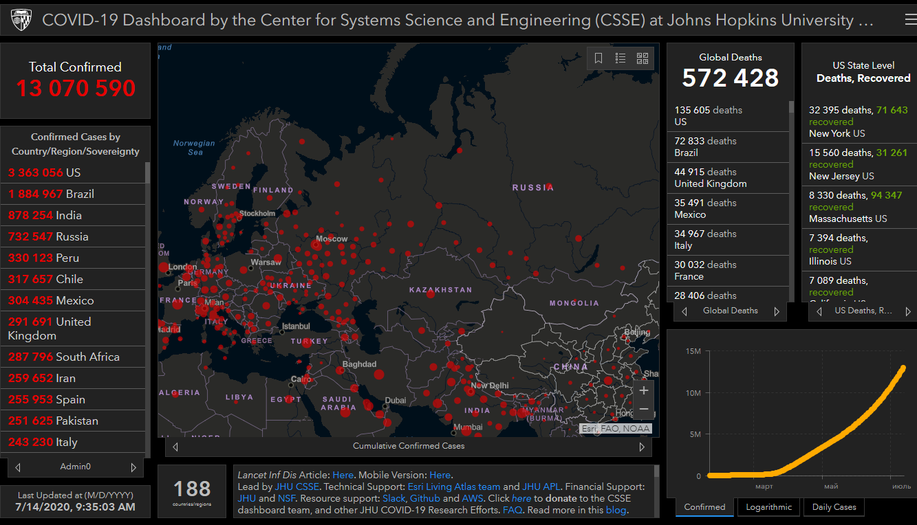 Всего в мире коронавирусом заразились 13 миллионов 70 тысяч 590 человек. Больше всего зараженных в США (3 миллиона 363 тысячи 56), Бразилии (1 миллион 884 тысячи 967), Индии (878 тысяч 254), России (732 тысячи 547), Перу (330 тысяч 123), Чили (317 тысяч 657), Мексике (304 тысячи 435) и Великобритании (291 тысяча 691).