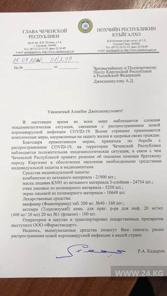 Уточняется, что Рамзан Кадыров выделил Кыргызстану комбинезоны, защитные маски, очки, лекарственные препараты, включая авифавир — лекарство от коронавируса.