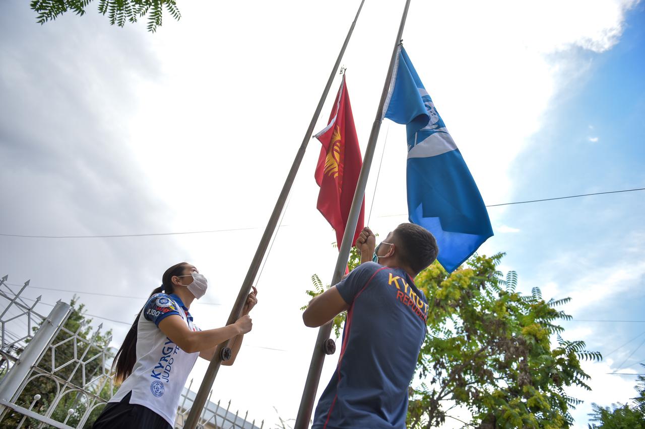 Чести поднять флаг удостоились юные спортсмены Бегай Бейшеналы кызы — мастер спорта КР по дзюдо, призер международных турниров и Марлен Асыкеев — член национальной сборной команды по греко-римской борьбе, мастер спорта международного класса.