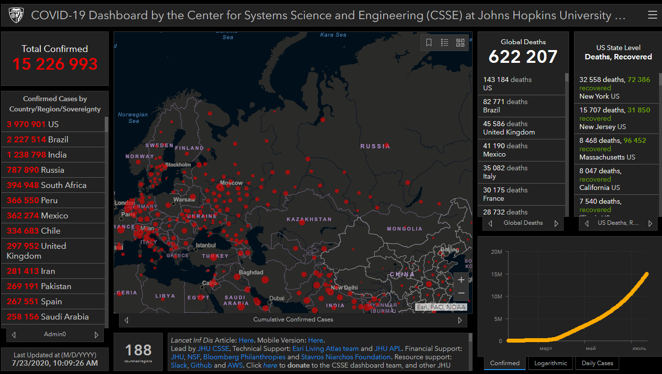 Всего в мире коронавирусом заразились 15 миллионов 226 тысяч 993 человека. Больше всего зараженных в США (3 миллиона 970 тысяч 901), Бразилии (2 миллиона 227 тысяч 514), Индии (1 миллион 238 тысяч 798), России (787 тысяч 890), Южной Африке (394 тысячи 948), Перу (366 тысяч 550), Мексике (362 тысячи 274), Чили (334 тысячи 683) и Великобритании (297 тысяч 952).