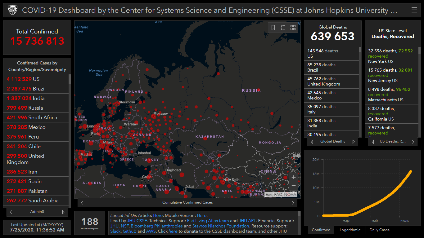 Всего в мире коронавирусом заразились 15 миллионов 736 тысяч 813 человек. Больше всего зараженных в США (4 миллиона 112 тысяч 529), Бразилии (2 миллиона 287 тысяч 475), Индии (1 миллион 337 тысяч 24), России (799 тысяч 499), Южной Африке (421 тысяча 996), Мексике (378 тысяч 285), Перу (375 тысяч 961), Чили (341 тысяча 304) и Великобритании (299,5 тысячи).
