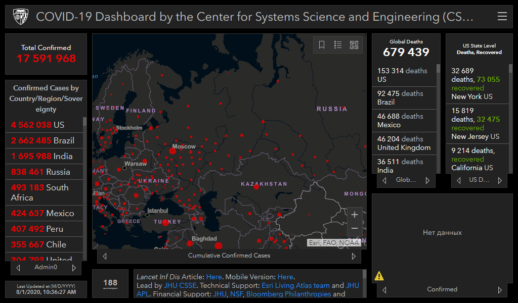 Всего в мире коронавирусом заразились 17 миллионов 591 тысяча 968 человек. Больше всего зараженных в США (4 миллиона 562 тысячи 38), Бразилии (2 миллиона 662 тысячи 485), Индии (1 миллион 695 тысяч 988), России (838 тысяч 461), Южной Африке (493 тысячи 183), Мексике (424 тысячи 637), Перу (407 тысяч 492), Чили (355 тысяч 667) и Великобритании (304 тысячи 793).