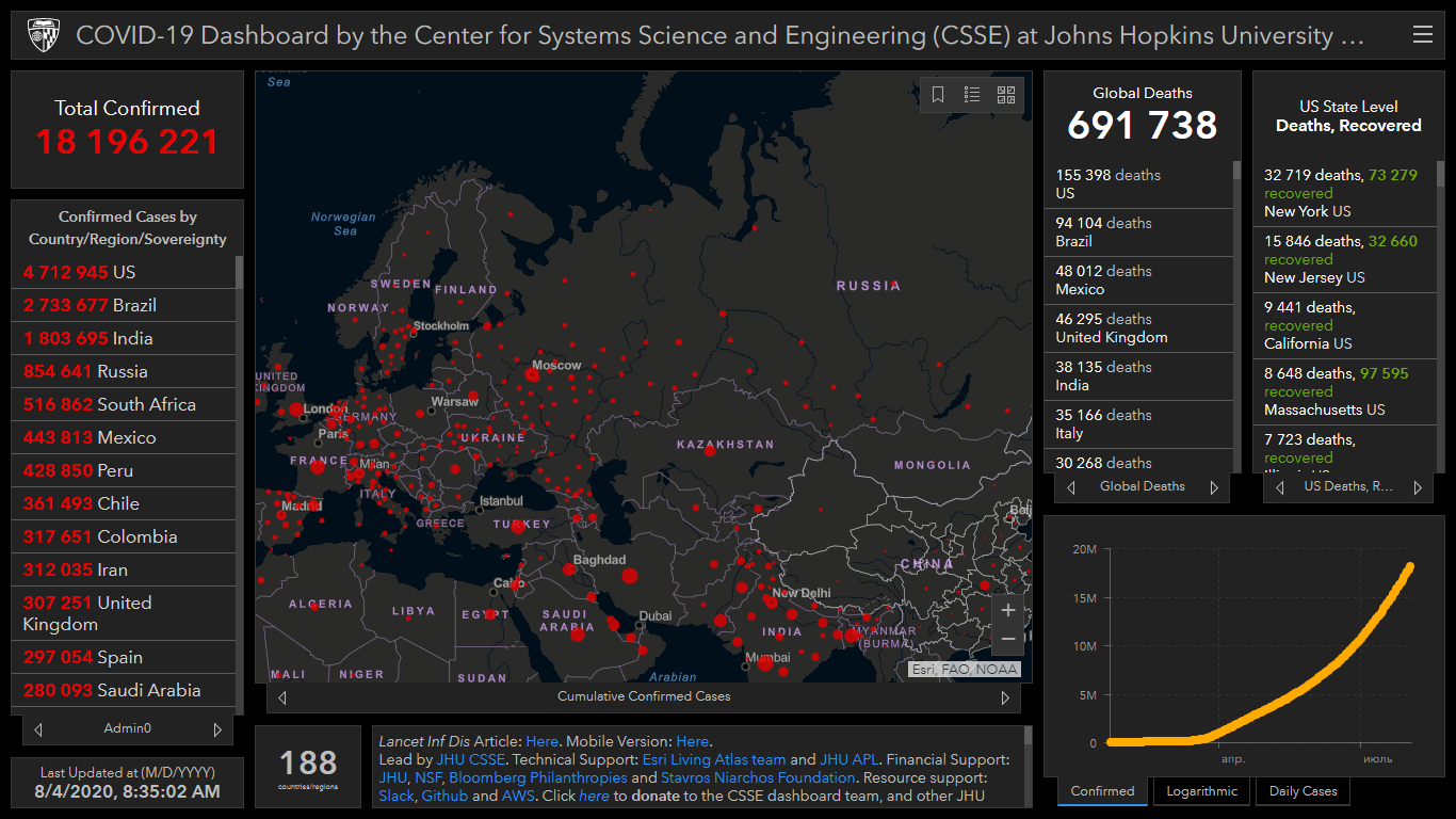 Всего в мире коронавирусом заразились 18 миллионов 196 тысяч 221 человек. Больше всего зараженных в США (4 миллиона 712 тысяч 945), Бразилии (2 миллиона 733 тысячи 677), Индии (1 миллион 803 тысячи 695), России (854 тысячи 941), Южной Африке (516 тысяч 862), Мексике (443 тысячи 813), Перу (428 тысяч 850), Чили (361 тысяча 493) и Колумбии (317 тысяч 651).
