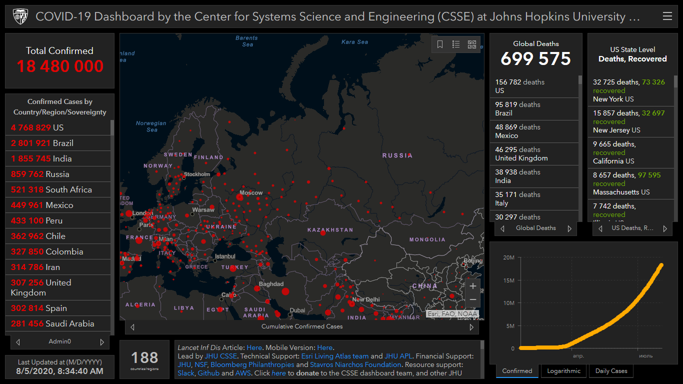 Всего в мире коронавирусом заразились 18 миллионов 480 тысяч человек. Больше всего зараженных в США (4 миллиона 768 тысяч 829), Бразилии (2 миллиона 801 тысяча 921), Индии (1 миллион 855 тысяч 745), России (859 тысяч 762), Южной Африке (521 тысяча 318), Мексике (449 тысяч 961), Перу (433,1 тысячи), Чили (362 тысячи 962) и Колумбии (327 тысяч 850).