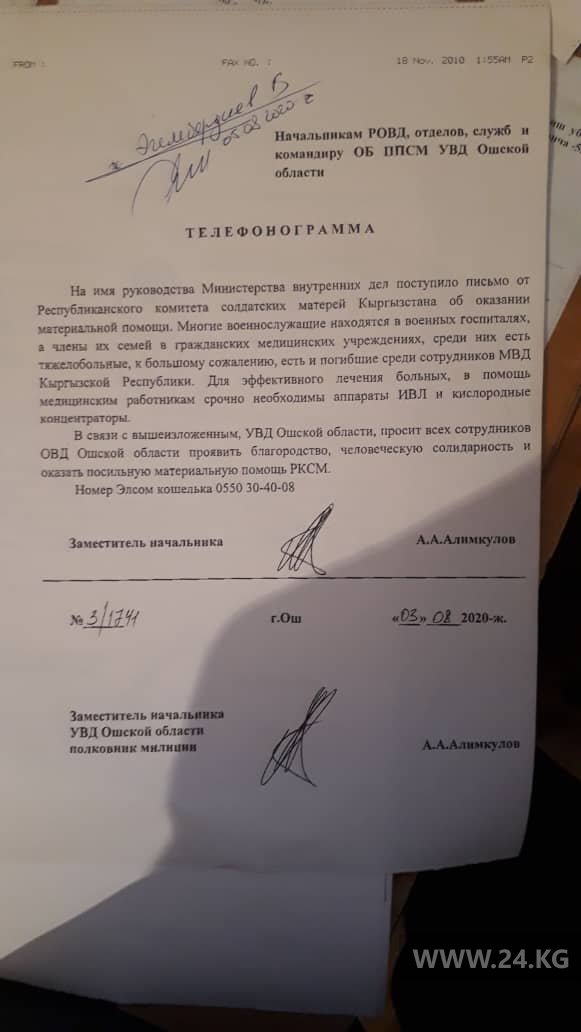 «УВД Ошской области просит всех сотрудников проявить благородство, человеческую солидарность и оказать посильную материальную помощь комитету солдатских матерей», — просит замначальника УВД региона Абилбек Алимкулов.