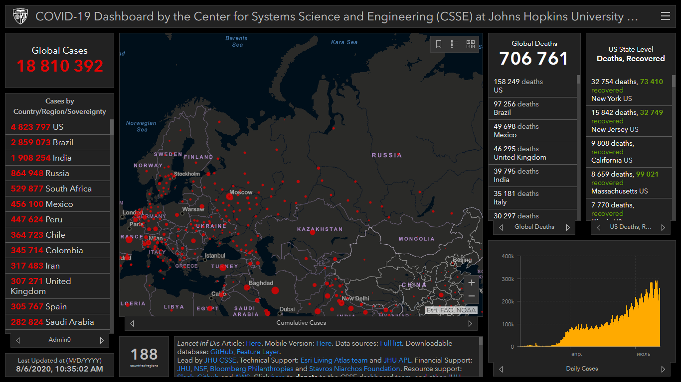 Всего в мире коронавирусом заразились 18 миллионов 810 тысяч 392 человека. Больше всего зараженных в США (4 миллиона 823 тысячи 797), Бразилии (2 миллиона 859 тысяч 73), Индии (1 миллион 908 тысяч 254), России (864 тысячи 948), Южной Африке (529 тысяч 877), Мексике (456,1 тысячи), Перу (447 тысяч 624), Чили (364 тысячи 723) и Колумбии (345 тысяч 714).