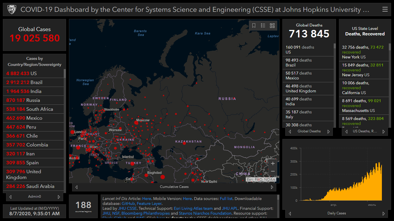 Всего в мире коронавирусом заразились 19 миллионов 25 тысяч 580 человек. Больше всего зараженных в США (4 миллиона 882 тысячи 433), Бразилии (2 миллиона 912 тысяч 212), Индии (1 миллион 964 тысячи 536), России (870 тысяч 187), Южной Африке (538 тысяч 184), Мексике (462 тысячи 690), Перу (447 тысяч 624), Чили (366 тысяч 671) и Колумбии (357 тысяч 702).
