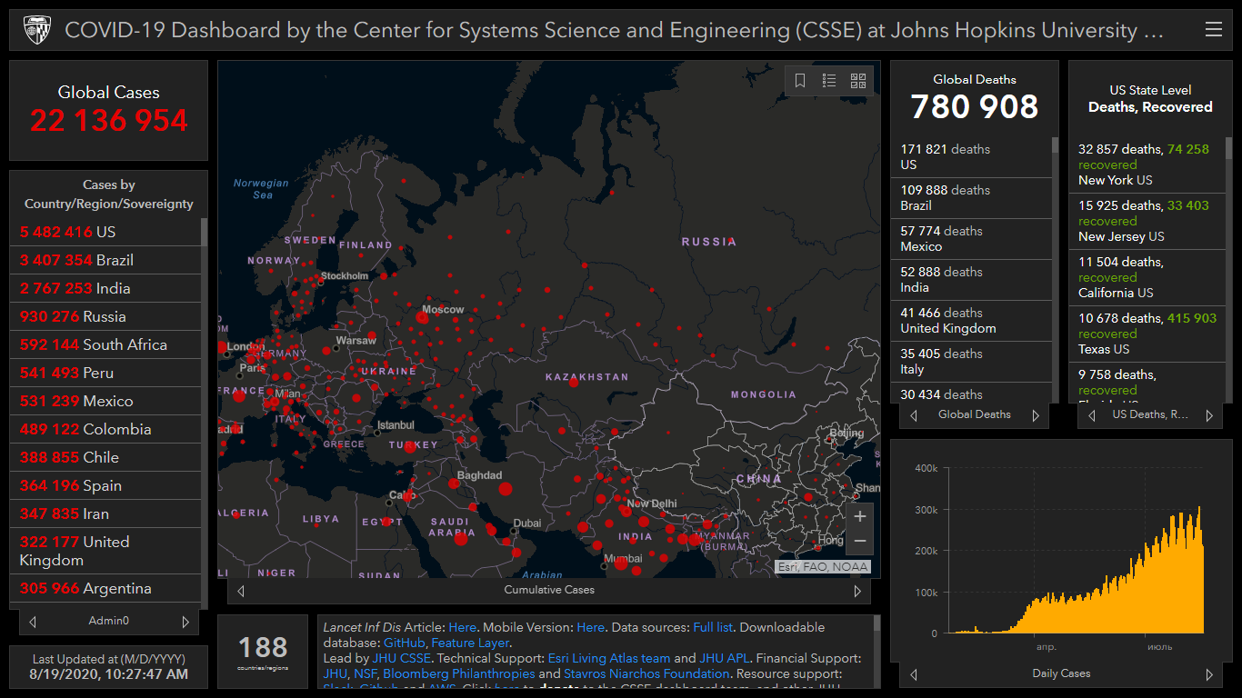 Всего в мире коронавирусом заразились 22 миллиона 136 тысяч 954 человека. Больше всего зараженных в США (5 миллионов 482 тысячи 416), Бразилии (3 миллиона 407 тысяч 354), Индии (2 миллиона 767 тысяч 253), России (930 тысяч 276), Южной Африке (592 тысячи 144), Перу (541 тысяча 493), Мексике (531 тысяча 239), Колумбии (489 тысяч 122) и Чили (388 тысяч 855).