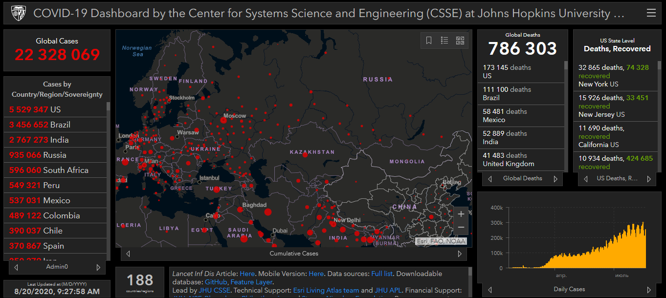 Всего в мире коронавирусом заразились 22 миллиона 328 тысяч 69 человек. Больше всего зараженных в США (5 миллионов 529 тысяч 347), Бразилии (3 миллиона 456 тысяч 652), Индии (2 миллиона 767 тысяч 273), России (935 тысяч 66), Южной Африке (596 тысяч 60), Перу (549 тысяч 321), Мексике (537 тысяч 31), Колумбии (489 тысяч 122) и Чили (390 тысяч 37).