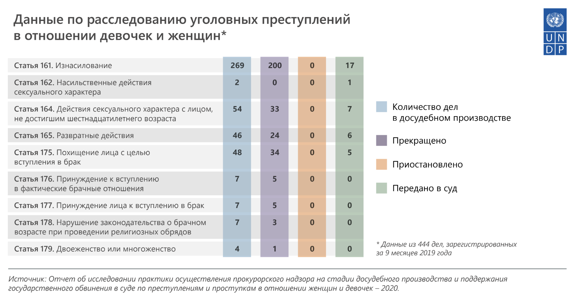 Согласно его данным, за девять месяцев 2019 года 269 дел находились на стадии досудебного производства по статье «Изнасилование», 200 из них прекращены, 17 — переданы в суд.