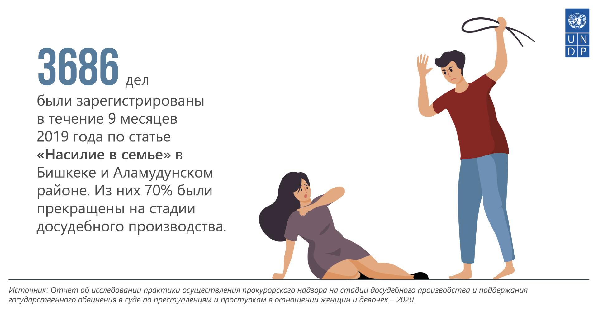 Примечательно, что в Бишкеке и Аламединском районе в течение девяти месяцев 2019 года зарегистрировано 3 тысячи 686 дел по статье «Семейное насилие». Из них 70 процентов прекращены на стадии досудебного производства.