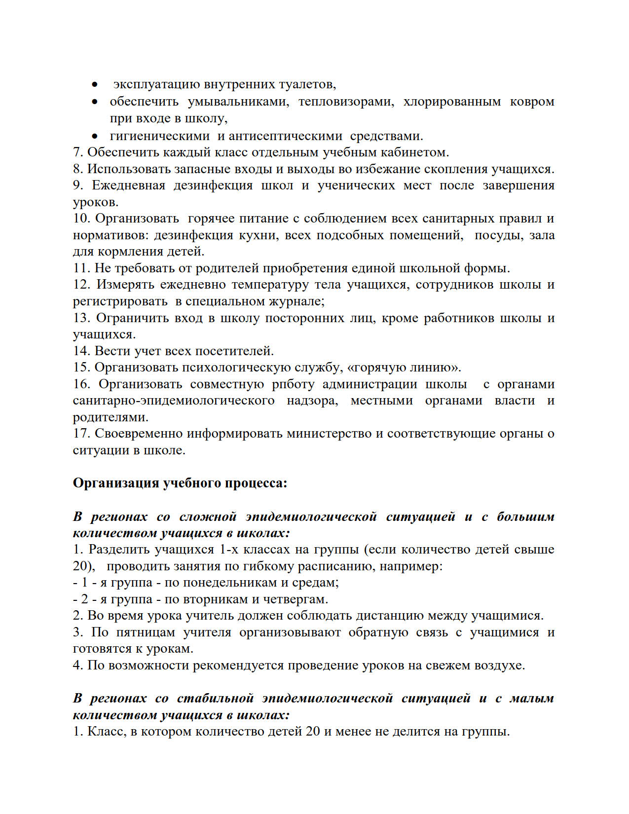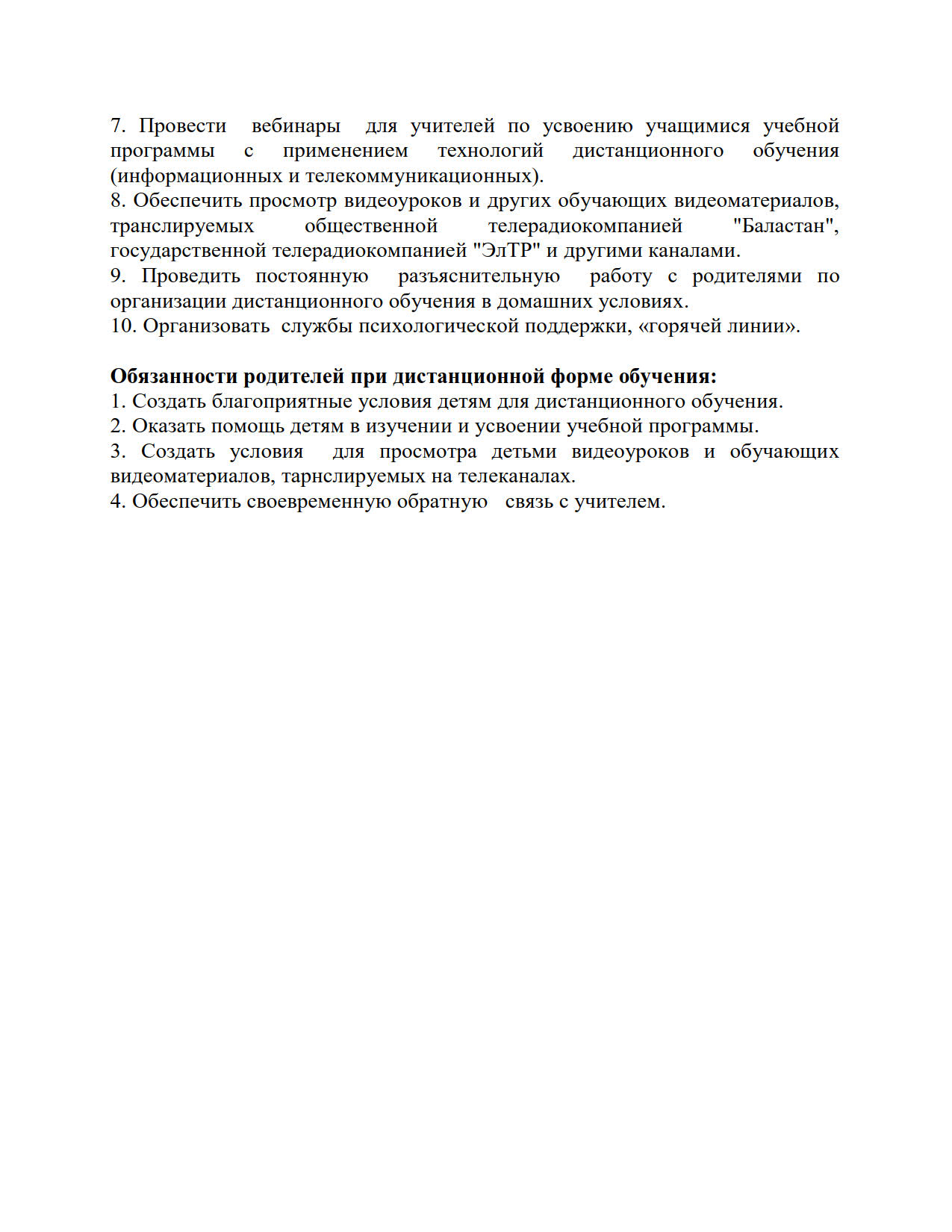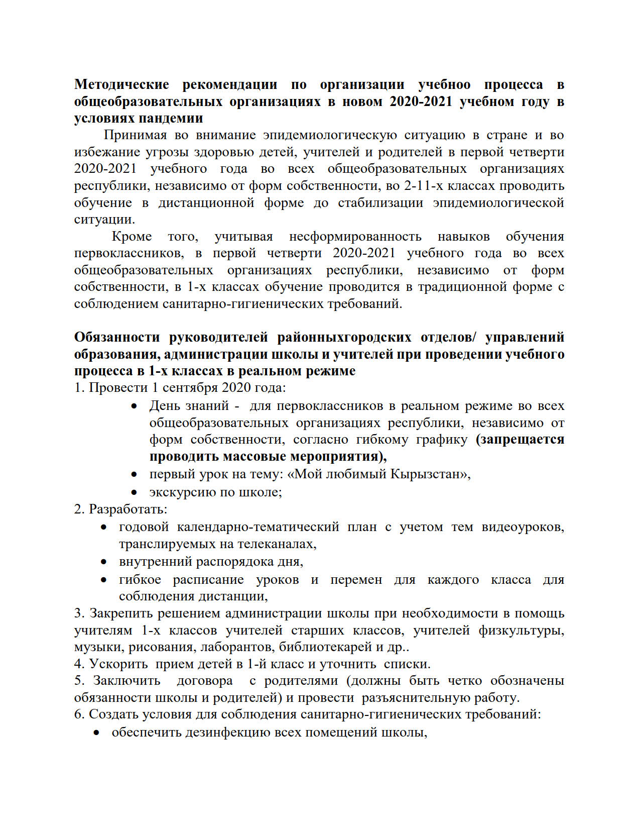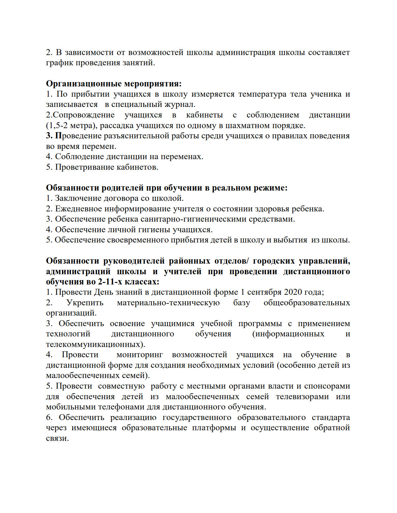В руководстве четко определены обязанности районных и городских отделов образования, руководителей, администраций школ и учителей по организации учебного процесса в традиционном и дистанционном форматах.