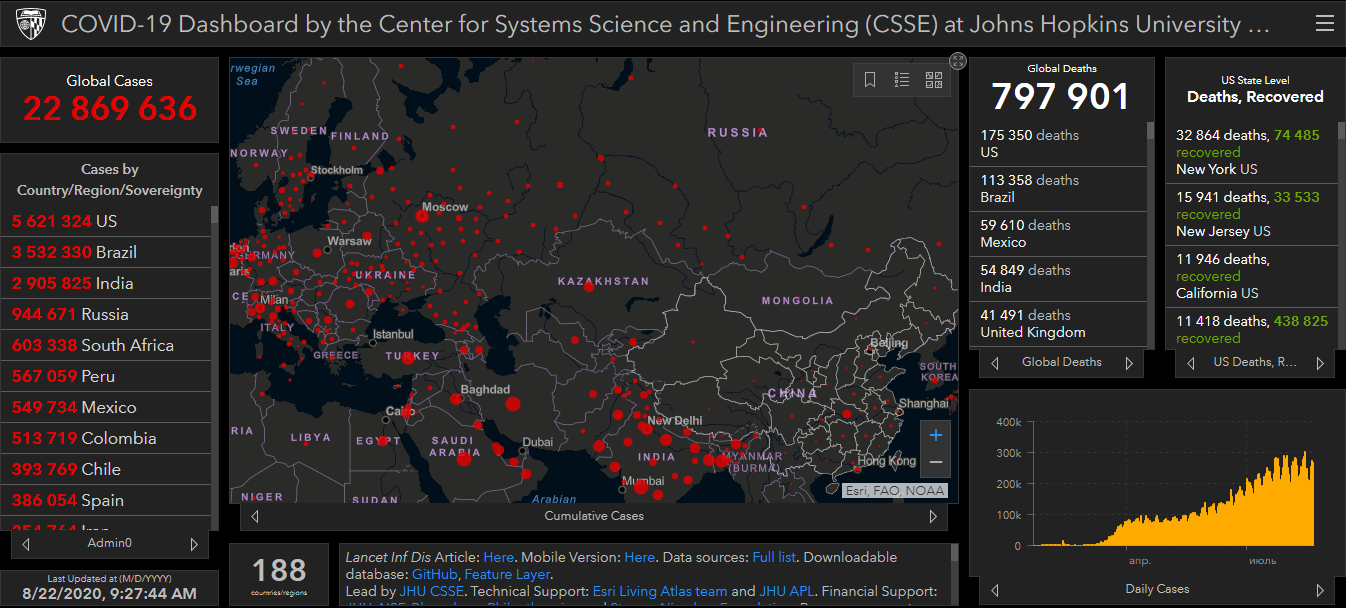 Всего в мире коронавирусом заразились 22 миллиона 869 тысяч 636 человек. Больше всего зараженных в США (5 миллионов 621 тысяча 324), Бразилии (3 миллиона 532 тысячи 330), Индии (2 миллиона 905 тысяч 825), России (944 тысячи 871), Южной Африке (603 тысячи 338), Перу (567 тысяч 59), Мексике (549 тысяч 734), Колумбии (513 тысяч 719) и Чили (393 тысячи 769).
