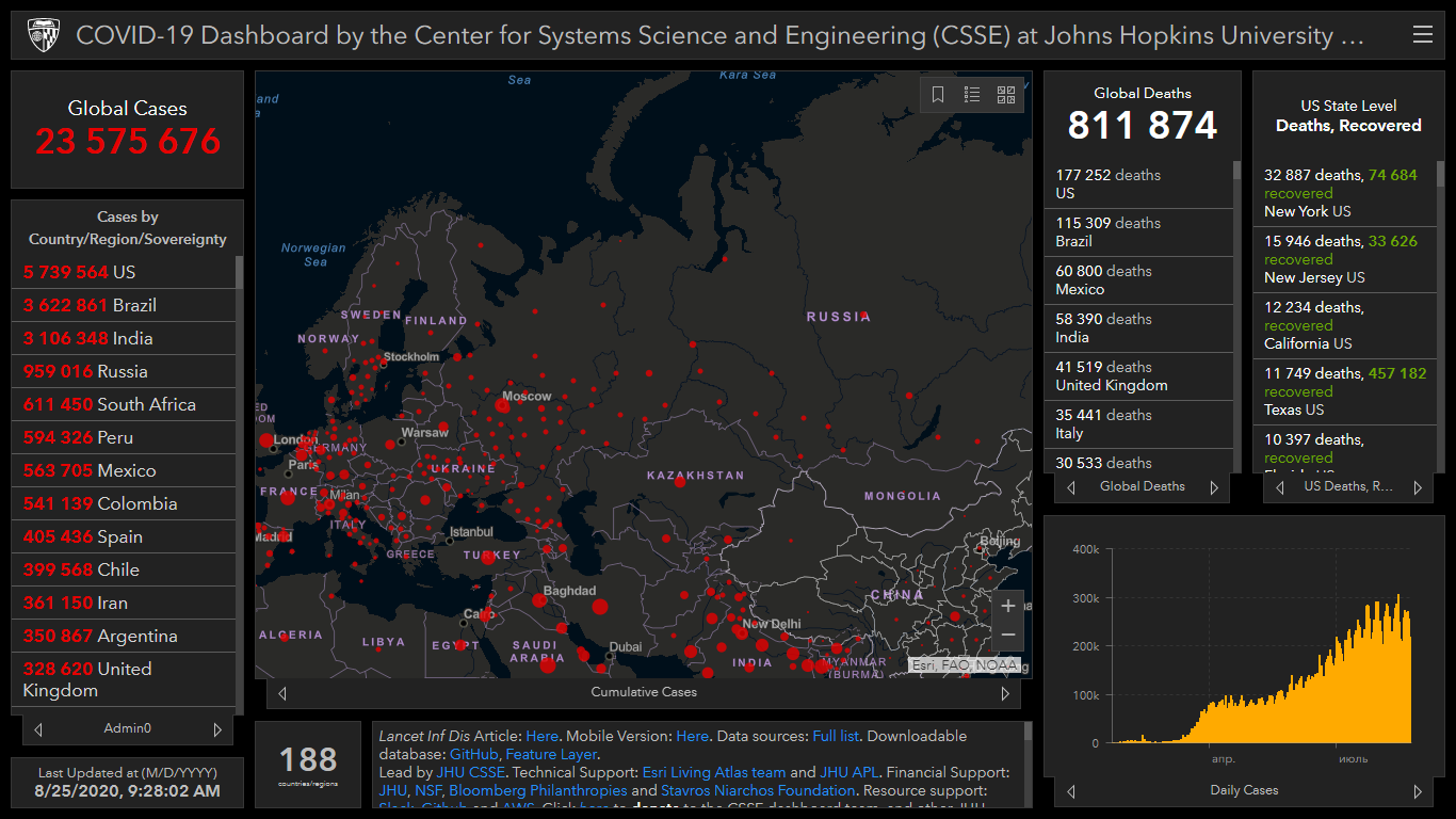 Всего в мире коронавирусом заразились 23 миллиона 575 тысяч 676 человек. Больше всего зараженных в США (5 миллионов 739 тысяч 564), Бразилии (3 миллиона 622 тысячи 861), Индии (3 миллиона 106 тысяч 348), России (959 тысяч 16), Южной Африке (611 тысяч 450), Перу (594 тысячи 326), Мексике (563 тысячи 705), Колумбии (541 тысяча 139) и Испания (405 тысяч 436).