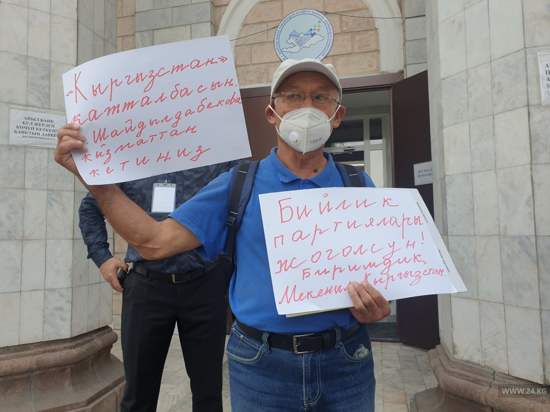Активист выступает за то, чтобы партию «Кыргызстан» сняли с предвыборной гонки. Участник акции протеста пояснил, что политобъединение опоздало с подачей документов, поэтому не имеет права участвовать в выборах.